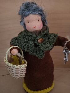 In haar handjes draagt ze een sleuteltje en een schaartje waarmee ze de aarde openmaakt. Ook heeft ze een mandje met fleurige lapjes.