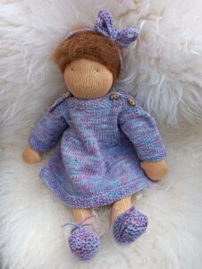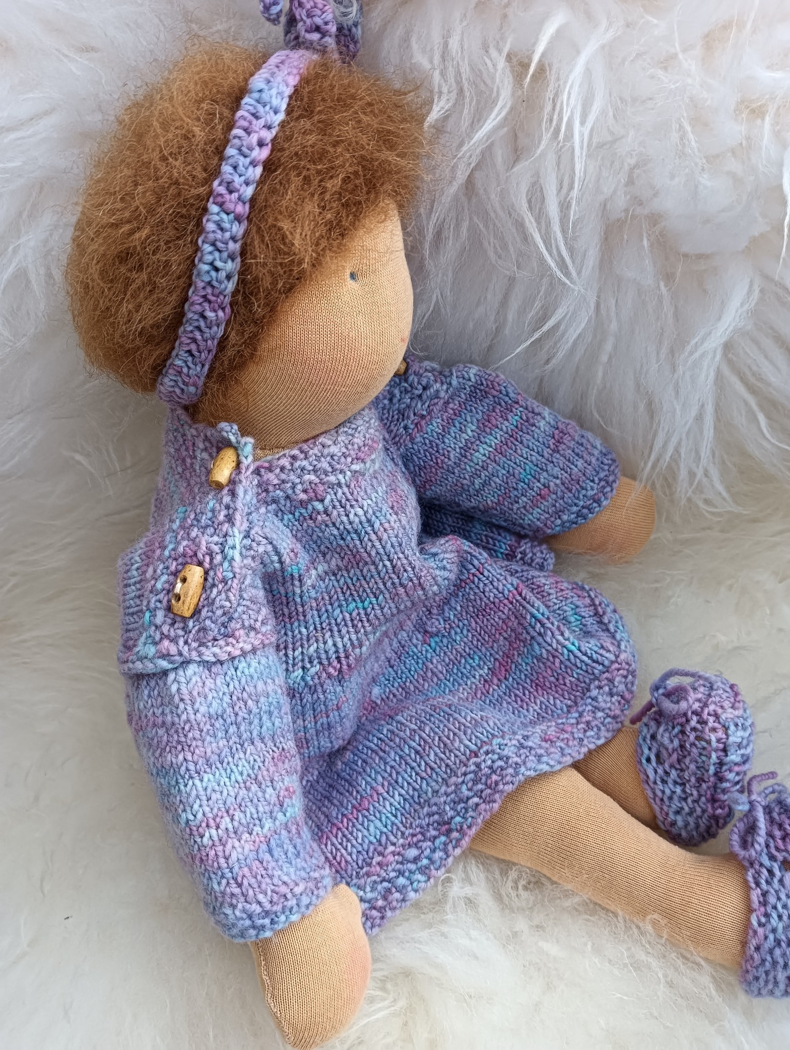 Julia draagt een handgebreid heerlijk zacht jurkje van handgesponnen wol. Haar schoentjes en haarband zijn uit hetzelfde ambachtelijke garen gemaakt helemaal met de hand evenals haar pruikje. Haar haren zijn gehaakt met Dolymohair en zacht te borstelen met een baby borsteltje.